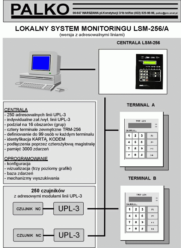 Terminal TRM-256 jest nowo opracowanym elementem Lokalnego Systemu Monitoringu (LSM-256) produkcji firmy PALKO. Został zaprojektowany w celu zwiększenia funkcjonalności tego systemu poprzez umożliwienie kontroli nad nim z kilku punktów obszaru objętego ochroną. Terminal nie wymaga żadnego specjalnego okablowania i może być dołączony do systemu w dowolnym miejscu linii transmisyjnej LSM-256 nawet w już oddanym do użytku systemie alarmowym.